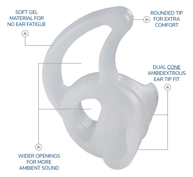 The Fin Ultra™ Ambi is made of soft Shore 25 silicone gel delivering all-day comfort and allows more ambient sound to pass through for improved situational awareness. The Fin Ultra™ Ambi fits more comfortably inside the contours of the ear, keeping the tip securely in the ear without the ear fatigue. The Fin Ultra™ Ambi is also the first ambidextrous ear tip that can be worn in the left or right ear.