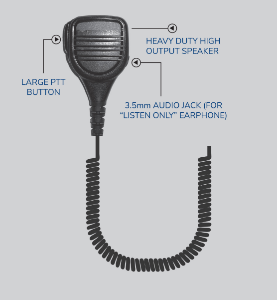 The Rhino Speaker Microphone features high-quality speaker and microphone elements that allow for clear audio while transmitting and receiving. The sleek speaker microphone also features a large PTT switch, a reinforced metal clip that rotates a full 360 degrees, Kevlar-reinforced polyurethane cables & impact resistant housing, and a 3.5mm audio jack for an external listen-only earpiece.