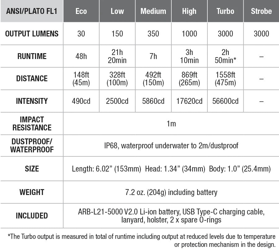 The included high-capacity 5000 mAh Li-ion battery can be conveniently charged through the USB Type-C port on the flashlight, making the Fenix TK20R V2.0 flashlight your go-to tool for high-intensity and long-lasting tactical performance.