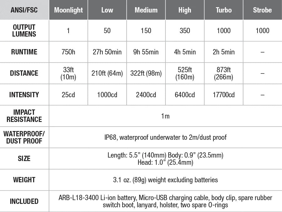 Fitted with the Cree XP-L HI V3 LED, this light delivers a maximum 1000 lumens at a distance of 873 feet (266 meters).